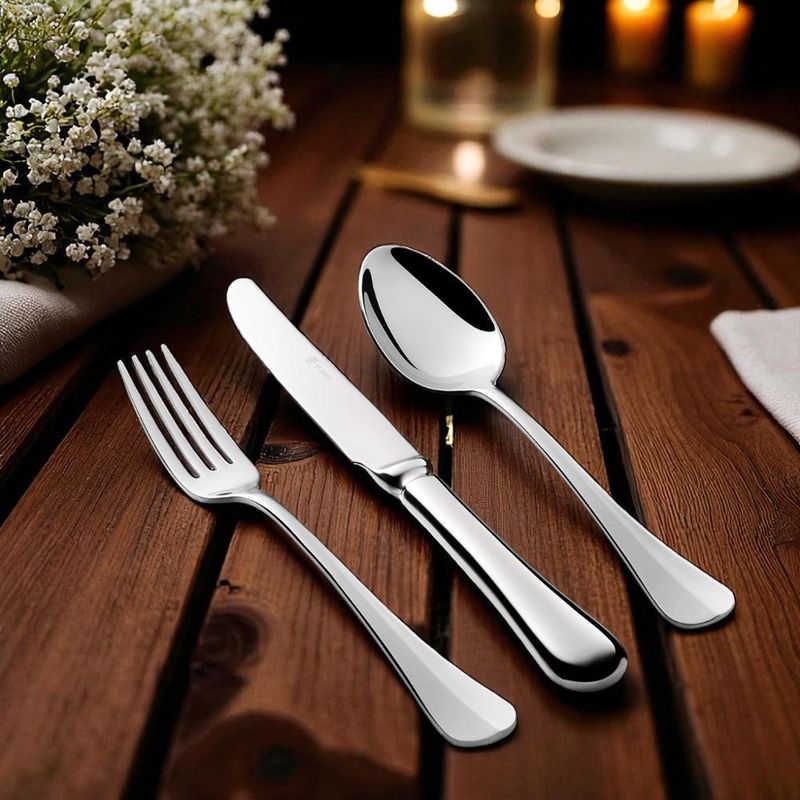 Cada talher é fabricado em aço inox, conhecido por ser um material robusto, que não enferruja e é de fácil manutenção, ideal para o uso diário e para resistir ao tempo. As facas, com o seu cabo inteiriço, demonstram a atenção ao detalhe e à ergonomia, oferecendo um manuseio confortável e seguro. O design Manchester adiciona um toque de sofisticação com suas linhas limpas e elegantes, tornando a sua mesa mais convidativa.