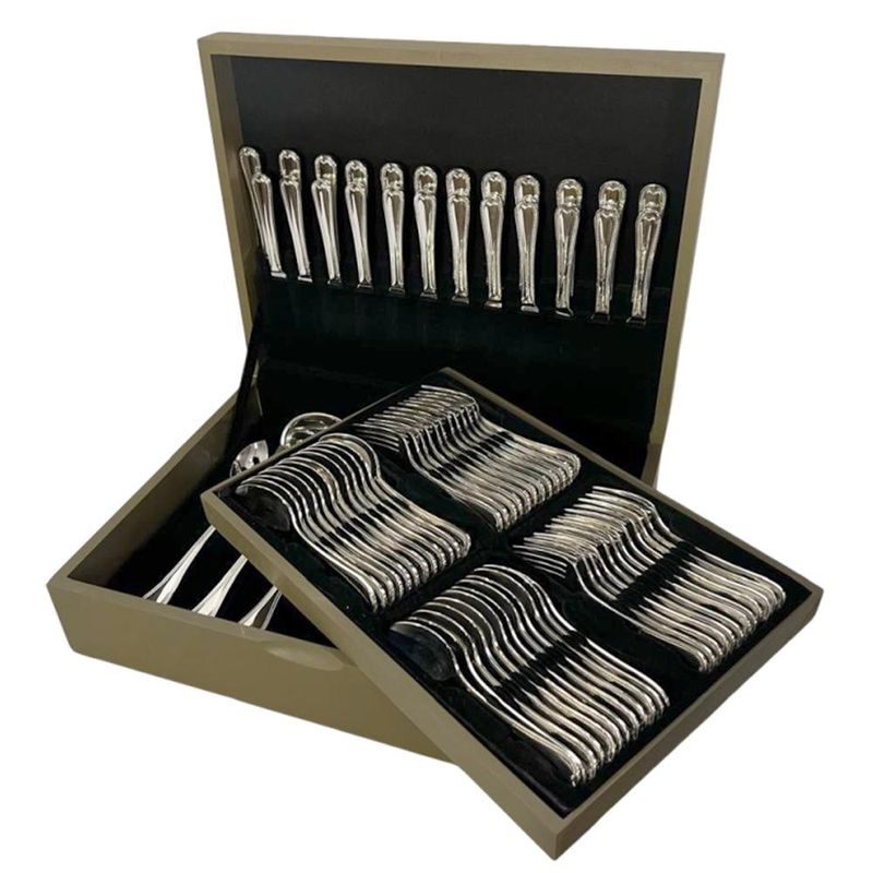 O faqueiro é elegantemente acondicionado em um estojo de madeira, forrado internamente para proteger cada peça. Além de garantir a longevidade da sua prata, o estojo é uma peça de exibição deslumbrante, adicionando luxo ao seu ambiente e facilitando a organização.