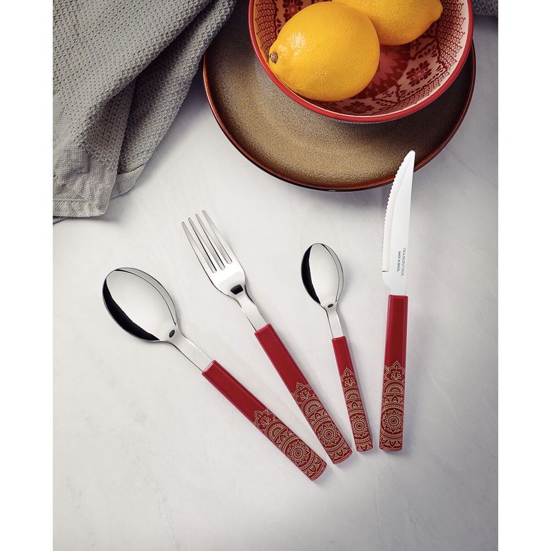 Deixe a composição da sua mesa impecável e cheia de estilo com o faqueiro Tramontina Bliss com lâminas em aço inox e cabos de polipropileno carmim 16 peças. Suas peças são produzidas com lâminas de aço inox, espessura e tratamento térmico que proporcionam maior resistência, durabilidade aos garfos e colheres e um excelente fio de corte às facas. Os cabos são em polipropileno na cor carmim e possuem uma linda serigrafia de mandalas, perfeita para agregar muito mais charme e beleza às suas refeições. Escolha os talheres Tramontina e veja sua mesa transformada!