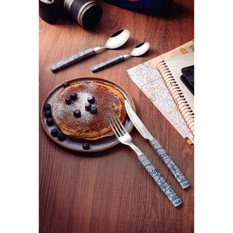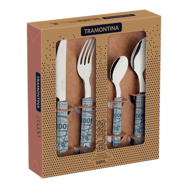 Para quem ama dar um toque descontraído na composição da sua mesa e deixá-la com muito mais estilo, precisa conhecer o faqueiro Tramontina Bliss com lâminas em aço inox e cabos de polipropileno cinza médio 16 peças. Suas peças têm inspiração no tema "primeira viagem", onde seus cabos de polipropileno contam com uma moderna estampa referente ao mesmo. Os talheres têm lâminas produzidas em aço inox e garantem um excelente fio de corte às facas, devido ao tratamento térmico e os garfos e colheres contam com maior resistência, graças a estampagem e a espessura do aço. Suas peças ainda podem ir à máquina de lavar louças e vão levar maior praticidade e facilidade para seu dia a dia. Escolha o faqueiro Tramontina Bliss e deixe sua mesa ainda mais encantadora!