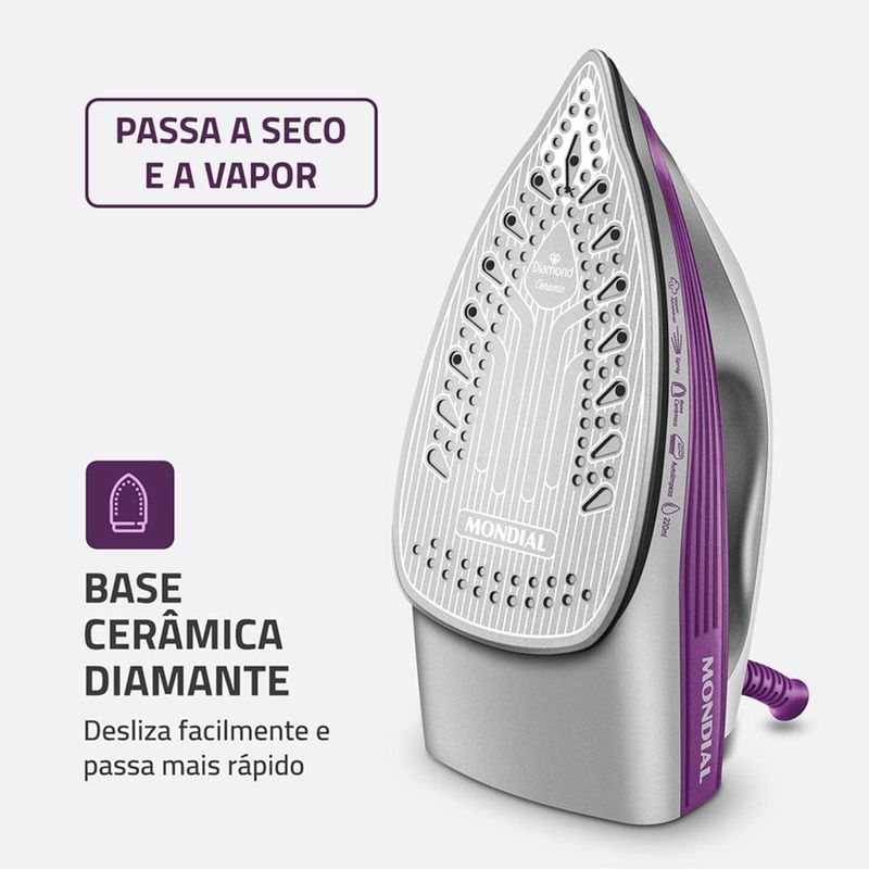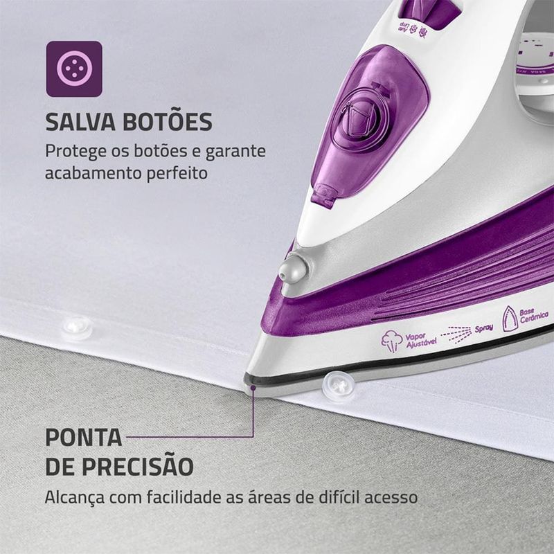 A Base Cerâmica Diamante desliza suavemente sobre os tecidos, acelerando o processo de passar. Com funções Vapor Contínuo e Spray Umedecedor, você remove amassados e vincos difíceis com facilidade.