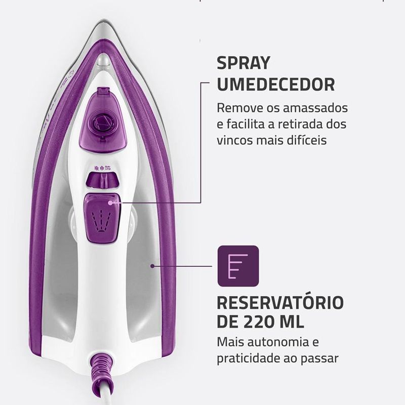 O reservatório de 220ml oferece autonomia para longas sessões de uso. Já o sistema autolimpeza evita o acúmulo de resíduos, mantendo o desempenho do ferro por mais tempo.