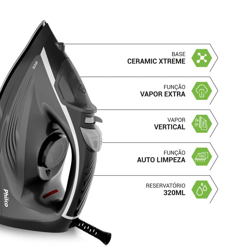 Imagine um Ferro de Passar com base em cerâmica avançada que desliza suavemente sobre os tecidos, sem grudar, proporcionando um resultado impecável em cada peça. Este é o Ferro de Passar a Vapor Philco PFV70!