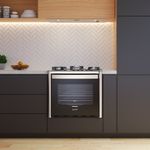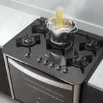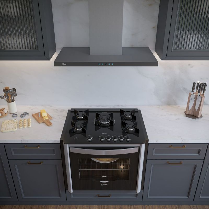 - Acabamento: Mesa de vidro temperado na cor preta; Suporte da trempe esmaltado em easy clean preto; Trempe individual; Manipuladores (botões) na cor preto removíveis; Fogão com 5 queimadores: 1 queimador tripla chama ( 3750W) 1 queimador rápido (2850W), 3 queimadores semirrápidos (1950W); Forno com 1 queimador (3500W); Potência elétrica grill/dourador: 1000W; Puxador em alumínio escovado anodizado; Laterais em aço pintado silver; Porta com vidro duplo serigrafado e amplo visor; Perfil frontal em aço pintado silver; Resistência interna do forno blindada; 2 Grades cromadas, ajustáveis, deslizantes e removíveis; Bandeja esmaltada para resíduos - removível; Corpo interno com revestimento especial easy clean de fácil limpeza.