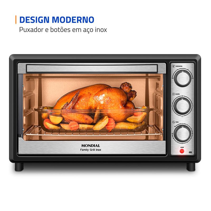 O Forno Elétrico Mondial Family Grill Inox traz mais espaço e praticidade para o preparo das suas receitas. Com 48 litros de capacidade, é ideal tanto para pequenas porções quanto para refeições completas em família. Seu grill dourador proporciona alimentos crocantes por fora e suculentos por dentro, realçando o sabor e o visual das receitas.