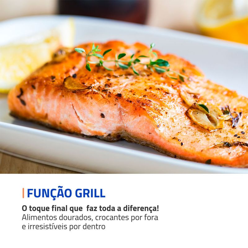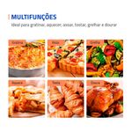 Multifunções: Versátil e prático, permite aquecer, assar, tostar, gratinar, grelhar e dourar com rapidez e eficiência, oferecendo resultados perfeitos em diversos tipos de receitas.