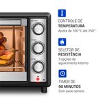 Timer de 90 Minutos: Permite programar o tempo de preparo com praticidade e segurança. Conta com desligamento automático e aviso sonoro, oferecendo mais comodidade para você realizar outras tarefas enquanto o forno faz o trabalho.