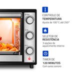 Timer de 90 Minutos: Permite programar o tempo de preparo com praticidade e segurança. Conta com desligamento automático e aviso sonoro, oferecendo mais comodidade para você realizar outras tarefas enquanto o forno faz o trabalho.