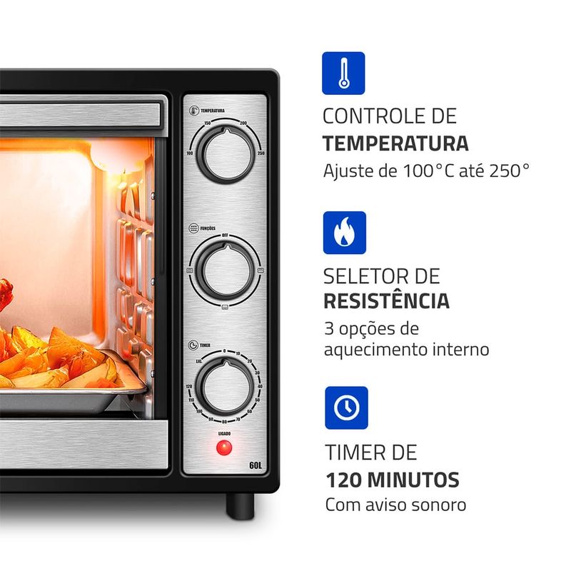 Capacidade de 60 Litros: Espaçoso e com alto desempenho, permite preparar vários pratos ao mesmo tempo ou assar receitas grandes, ideal para toda família.