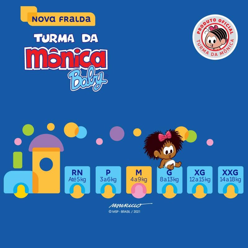 A Turma da Mônica Baby uniu proteção e conforto em uma nova opção de fralda, para garantir que seu bebê cresça feliz e tenha as melhores lembranças da sua infância. A Nova fralda Turma da Mônica Baby possui a nova Tecnologia QuatroSec para que ele fique calmo, tranquilo e seguro durante o dia e a noite toda. Conta com um exclusivo sistema de canais que distribui mais rápido o xixi, barreiras anti-vazamento e uma fina camada extra que ajuda a manter o bebê sequinho por até 12 horas, além de cintura elástica que proporciona um perfeito ajuste no corpinho.