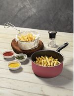 Batatinhas fritas, mandioca e bolinhos de chuva ficam mais saudáveis quando fritos da maneira correta. A fritadeira vem acompanhada de um cesto, para retirar do óleo quente os petiscos e escorrê-los sem o risco de queimaduras. Produto da Linha Chilli, a fritadeira é fabricada em alumínio com revestimento interno Pro-Flon que não gruda e é fácil de limpar, uma garantia de acabamento superior, textura homogênea e maior resistência a riscos. Possui ainda pintura externa na cor vermelho cereja e cabo em baquelite. A fritadeira tem 20 cm de diâmetros, capacidade de 2,65 litros e pode ir à lava-louças.