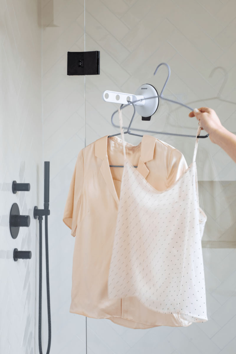 O gancho com ventosa Brabantia é a solução ideal para ventilar roupas ou pendurar cabides sem precisar furar paredes.