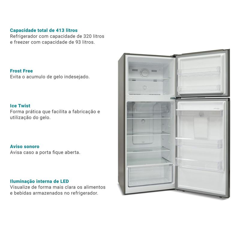 Capacidade de 413L (320L no refrigerador e 93L no freezer)