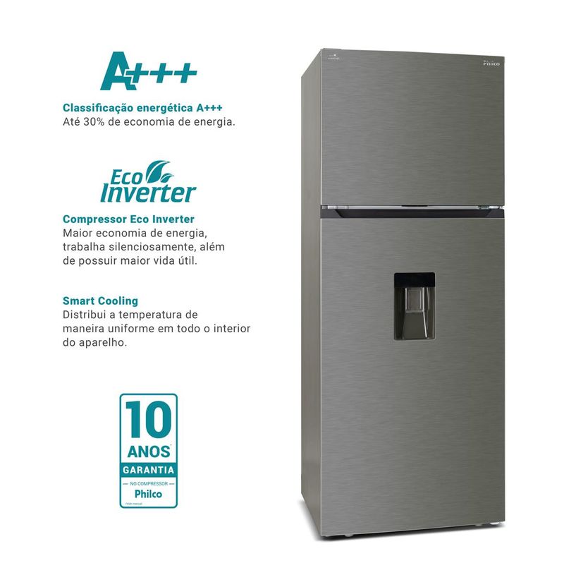 Por último, mas não menos importante, o Compressor Eco Inverter é eco-friendly, livre de gases prejudiciais ao meio ambiente. Ao escolher esta geladeira Philco, você não só está investindo em praticidade e economia, mas também contribuindo para um planeta mais sustentável.