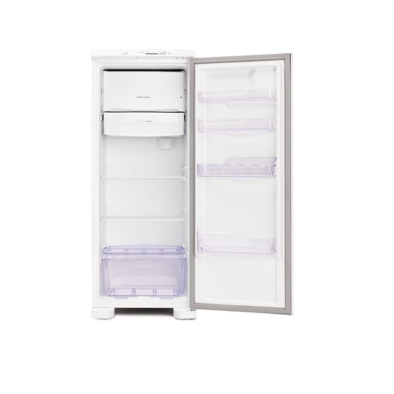 Diferenciais da Geladeira 240 Litros com freezerA Geladeira Electrolux Cycle Defrost conta com características que tornam seu uso muito mais prático e eficiente. Os seus principais diferenciais são:Prateleira porta-latas reversível: armazene até 5 latas de forma prática, com flexibilidade para liberar espaço no interior.Puxador embutido ergonômico: oferece um design moderno e com maior conforto e durabilidade;Economia de energia: com a classificação energética A, esse modelo possui um consumo mensal de apenas 23,3 kWh.