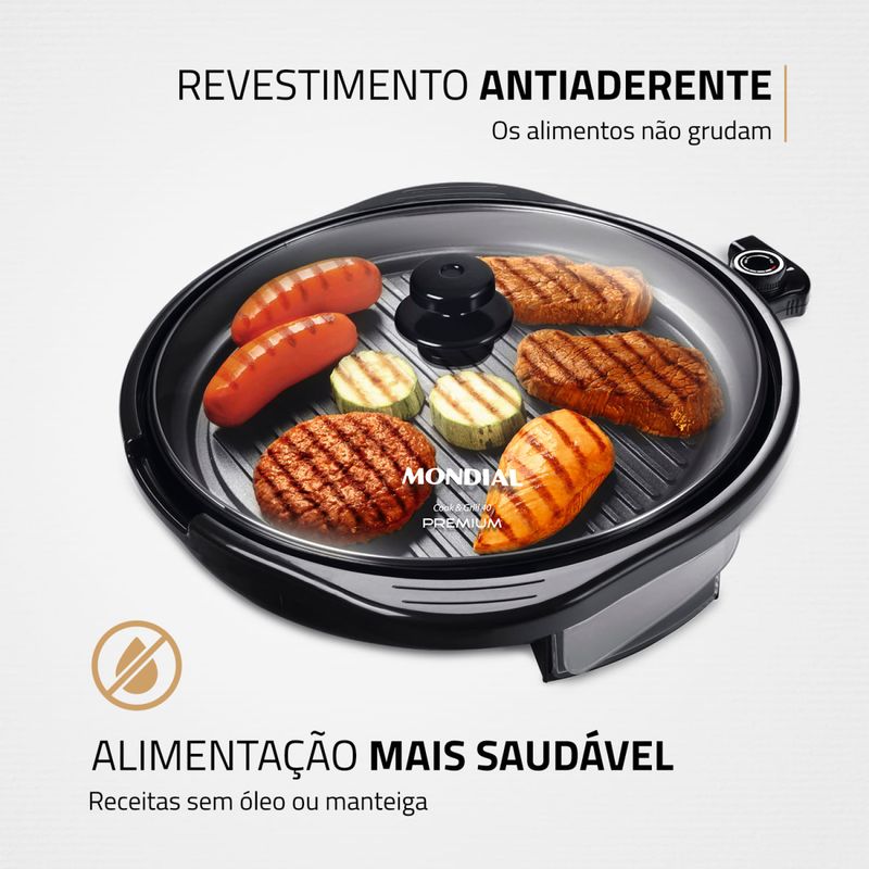 Com o Cook & Grill 40 Premium G-03 Mondial, você equipa sua cozinha com qualidade e eficiência. Seu revestimento antiaderente impede que os alimentos grudem na grelha, e por não precisar de óleo durante os preparos, garante uma alimentação mais saudável. Possui 40cm e permite preparar receitas para toda família. Receitas mais saborosas e saudáveis, além de mais praticidade no dia a dia! Saiba mais sobre o G-03 da Mondial: