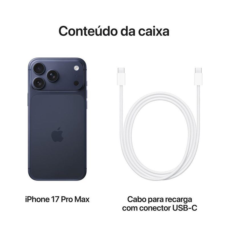 iPhone 17 Pro Max. O iPhone mais potente já produzido. Tela brilhante de 6,3 polegadas, estrutura unibody em alumínio, chip A19 Pro, câmeras traseiras de 48 MP e duração de bateria avançada.