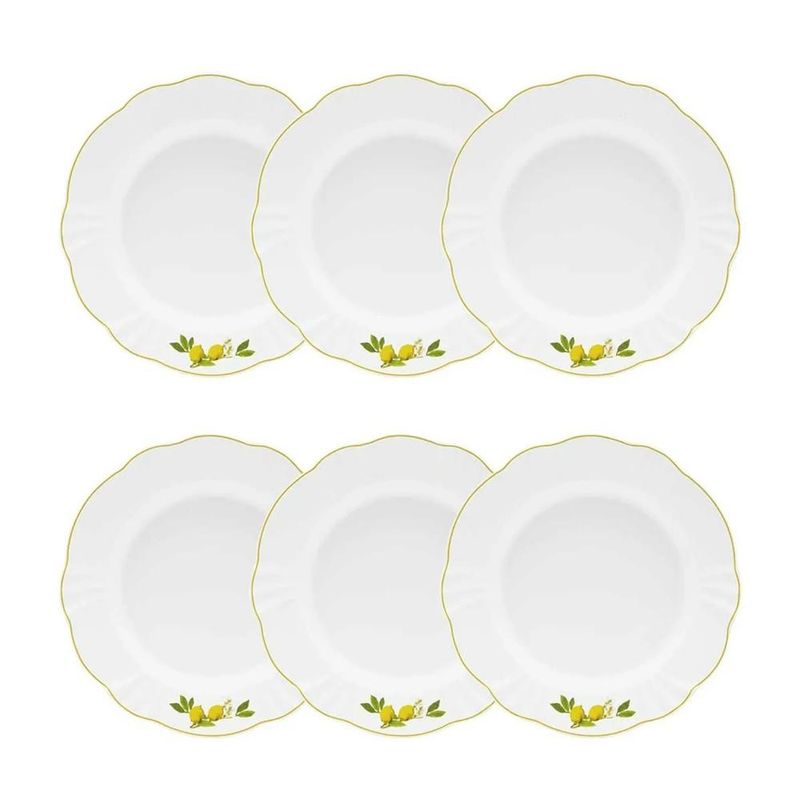Sirva sopas, caldos e massas com o charme da culinária italiana com o Jogo de 6 Pratos Fundos Soleil Limoni. A estampa de limão siciliano, tema clássico na cerâmica italiana, resgata a história da porcelana e adiciona um toque de beleza e alegria à sua mesa.
