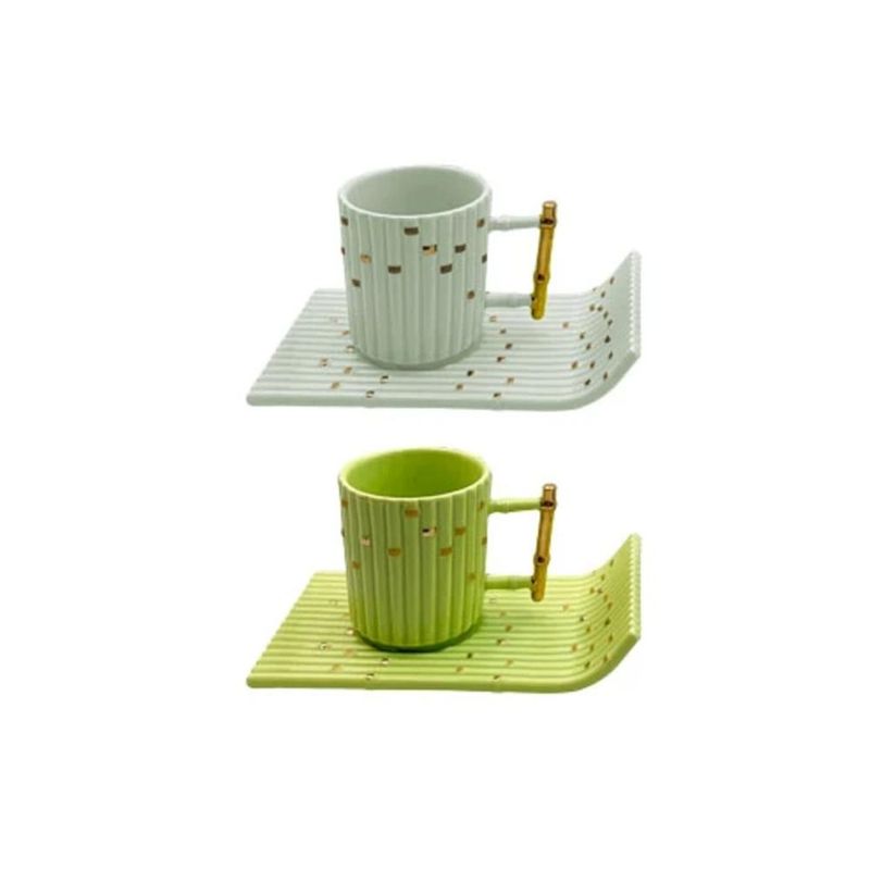 As xícaras e pires possuem texturas sutis e alças diferenciadas em dourado, combinando elegância e um toque contemporâneo. O material new bone china garante leveza e durabilidade às peças, sendo perfeito para o uso cotidiano ou para servir seus convidados com estilo.