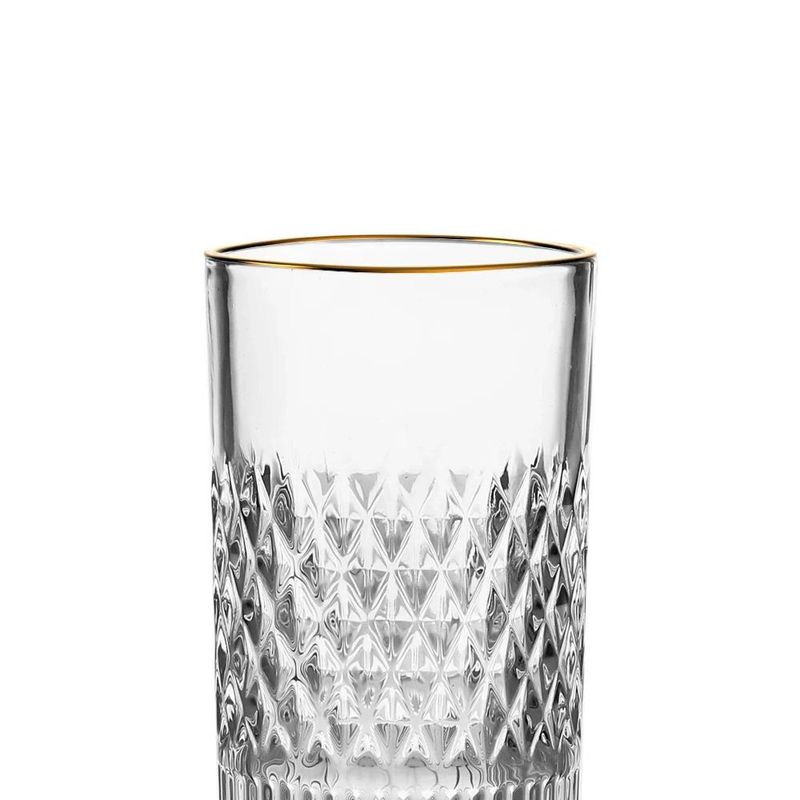 Com visual clássico e atemporal, o jogo de copos altos da coleção Esplanada combina textura diamantada com o brilho sofisticado da borda dourada. Ideal para compor mesas refinadas, é feito em cristal ecológico de alta transparência e resistência.