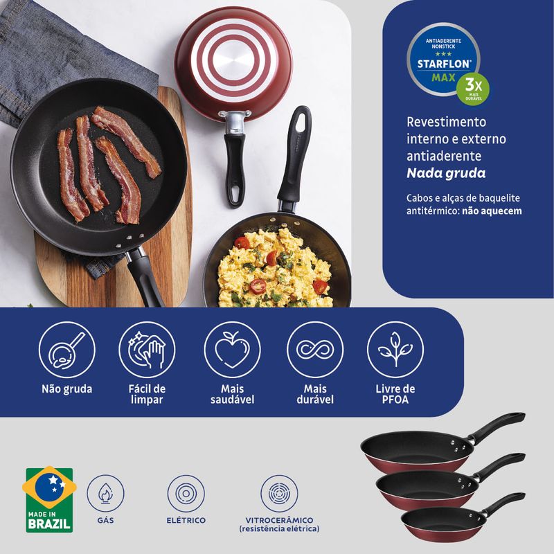 O jogo de frigideiras Tramontina Linz com revestimento interno e externo em antiaderente Starflon Max vermelho 03 peças vai conceder maior praticidade e versatilidade para o preparo das suas refeições. Suas peças são desenvolvidas com corpo de alumínio com espessura que proporciona cozimento rápido e uniforme e contam com revestimento interno e externo de antiaderente Starflon Max, material que evita que os alimentos grudem e as tornem fáceis de limpar. Os cabos são em baquelite antitérmico, material que oferece maior segurança durante o manuseio. Além de todas essas características, elas podem ir à máquina de lavar louças e vão deixar seu dia a dia na cozinha muito mais fácil!