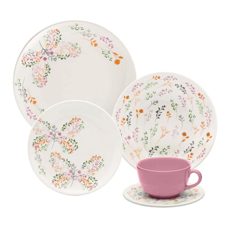 Conteúdo da Embalagem: 6 pratos rasos (26 cm) / 6 pratos fundos (20,5 cm) / 6 pratos de sobremesa (20 cm) / 6 xícaras de chá (200 ml) / 6 pires (14 cm).