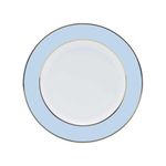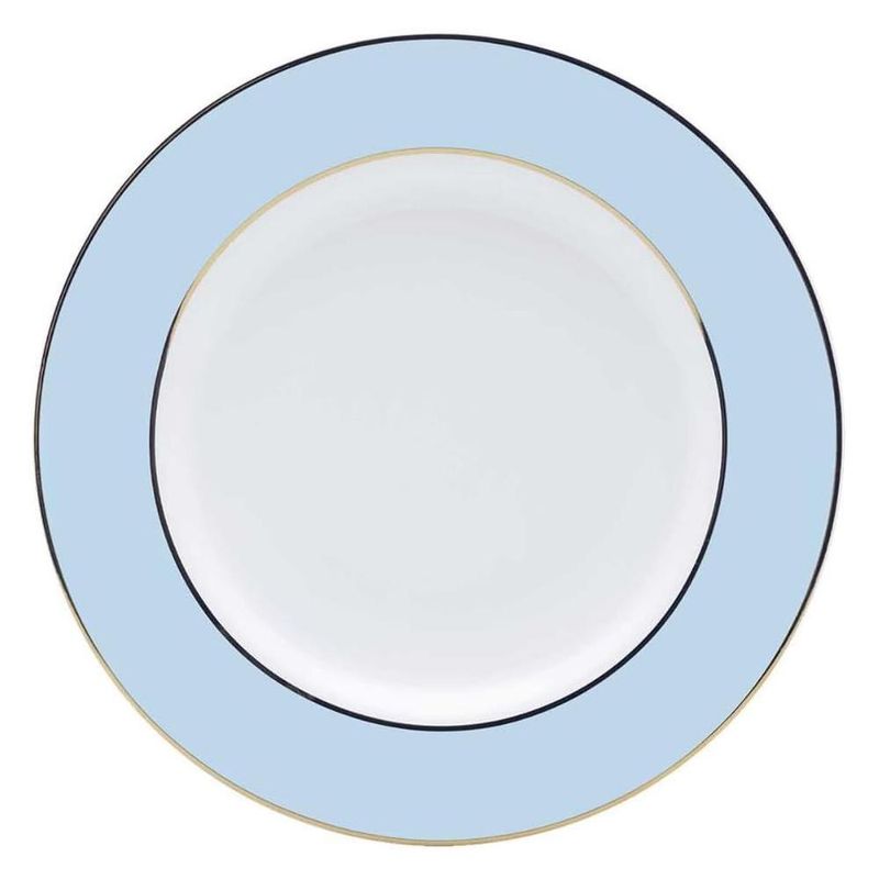 O design é marcado pela aba larga do formato Flamingo, que recebe uma decoração bicolor em um suave tom de azul e um delicado filete em ouro. Essa combinação confere à louça um brilho sutil, ideal para ocasiões especiais.
