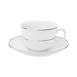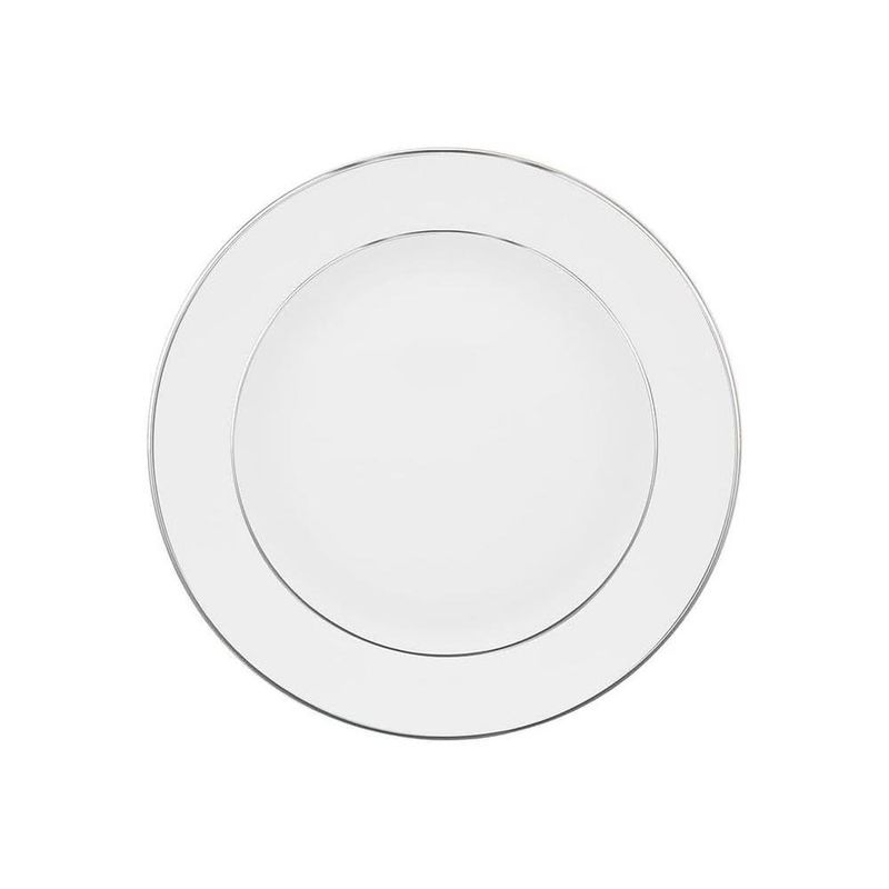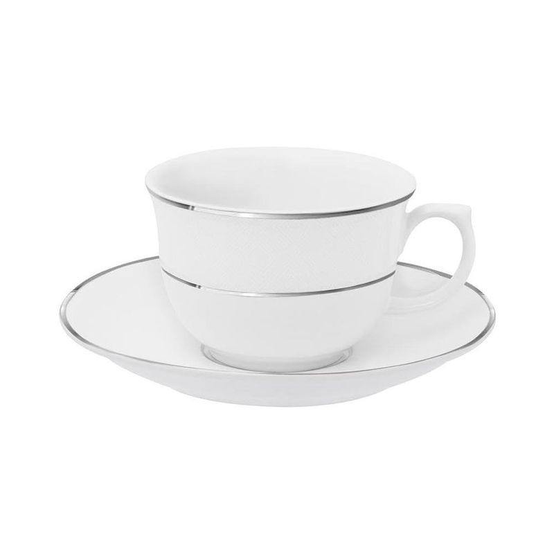 Feito em porcelana, o design aposta na elegância atemporal do branco sobre branco. As bordas das peças são adornadas com uma padronagem de linhas finas que criam uma textura sutil. O toque final de luxo é dado pelo delicado filete em prata que contorna cada item.