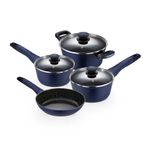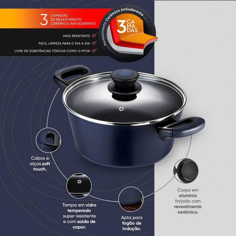 As panelas são feitas de alumínio forjado, o que as torna leves e garante uma distribuição uniforme do calor. Os cabos com revestimento soft touch oferecem mais segurança e conforto no manuseio. O jogo inclui 1 frigideira de 22 cm, 1 caçarola de 22 cm, 1 panela de 20 cm e 1 panela de 18 cm.