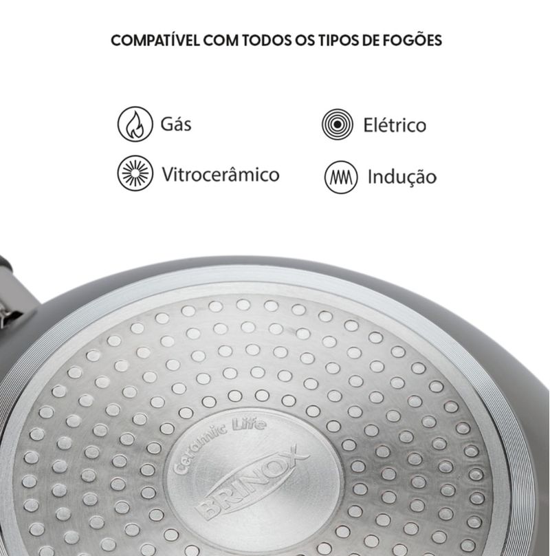 Tipos de Fogões: Compatível com todos os tipos de fogões: a gás, elétricos, de indução e vitrocerâmicos.