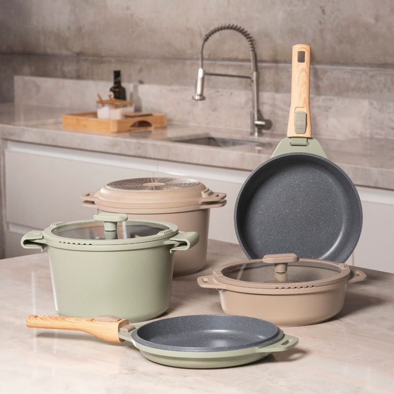 Transforme sua cozinha com o Jogo de Panelas Empilhável Brinox Loft 7 Peças da linha Ceramic Life. Com design moderno, acabamento siliconado verde e cabos com toque amadeirado, o conjunto une elegância, praticidade e tecnologia para o seu dia a dia.