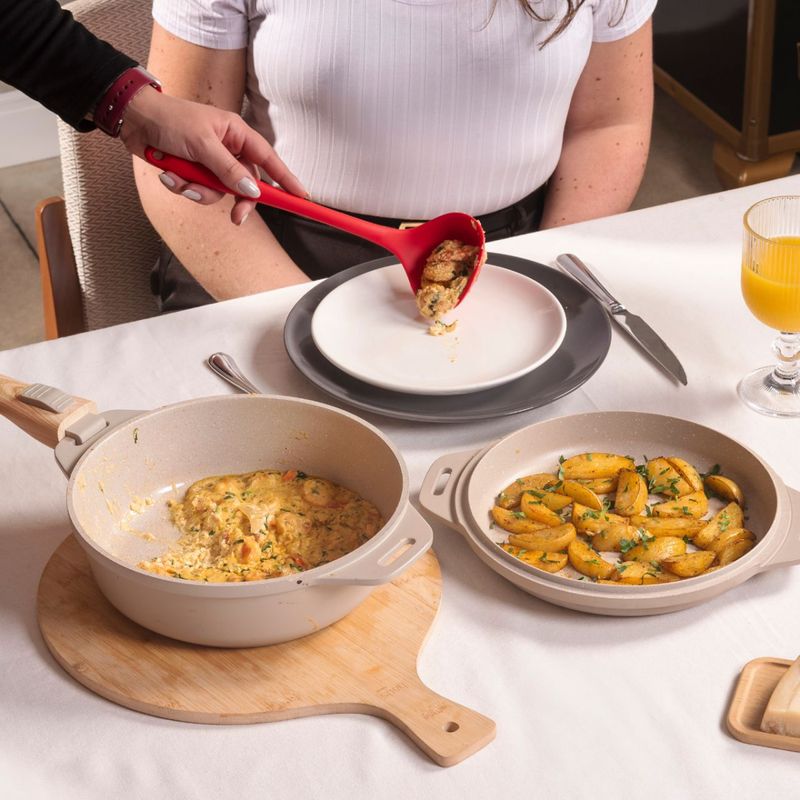 Com estrutura em alumínio de alta qualidade, as panelas aquecem de forma rápida e uniforme. A caçarola possui revestimento cerâmico Pro Ceramic Premium, enquanto as frigideiras são revestidas com Mineral Resist, ambos livres de PFOA e elementos tóxicos. Isso garante um cozimento mais saudável e limpeza muito mais fácil.