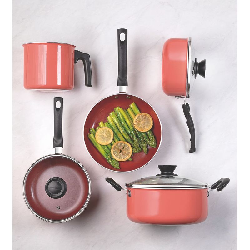 Leve praticidade e estilo para sua cozinha com o Jogo de Panelas Tramontina Évora em Alumínio com Revestimento Interno Cerâmico e Externo de Silicone Coral 5 Peças! Com peças produzidas com corpo de alumínio com espessura que proporciona cozimento rápido e uniforme dos alimentos e revestimento interno cerâmico e externo de silicone, ele é um jogo duráveis, resistente e perfeito para utilização no dia a dia. Seus cabos e alças em baquelite antitérmico e pegadores de nylon, reduzem a propagação de calor e aumentam a segurança e o conforto no manuseio. Além disso, as tampas que o acompanham são em vidro temperado com saída de vapor e bordas de aço inox e auxiliam no preparo e na visualização dos alimentos. Com a Tramontina, você tem os melhores itens para sua cozinha!