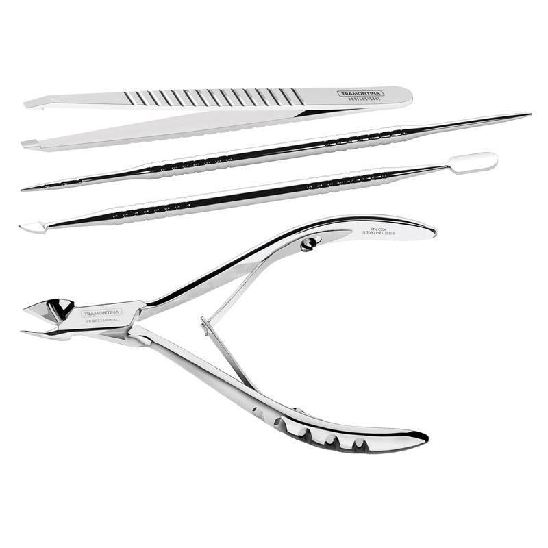 Cuide da sua autoestima com o Jogo para Cutículas e Pinça Tramontina em Aço Inox 4 Peças. Um kit com quatro peças em aço inox, perfeitas para serem levadas sempre com você! O empurrador/raspador e alicate para cutículas, palito e pinça, possuem características antideslizantes e design ergonômico que facilitam o manuseio e tornam seu uso muito mais prático e confortável. Todas as peças são esterilizáveis em autoclave, garantindo itens livres de bactérias. Com esse kit, fazer suas unhas e tirar aqueles pelinhos indesejados ficou muito melhor e mais fácil!
