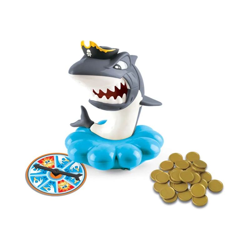 Um jogo divertido e dinâmico, mas tome cuidado com o Tubarão Pirata! Os jogadores devem recuperar o ouro roubado pelo tubarão, de pouco a pouco, girando a roleta que indica a quantidade de moedas que devem ser recuperadas por jogada. Se o tubarão atingir durante a sua jogada, você deve devolver metade do ouro que tem. O jogo acaba quando todas as moedas forem recuperadas, e ganha quem tiver acumulado mais moedas. O jogo funciona com 3 pilhas AA.