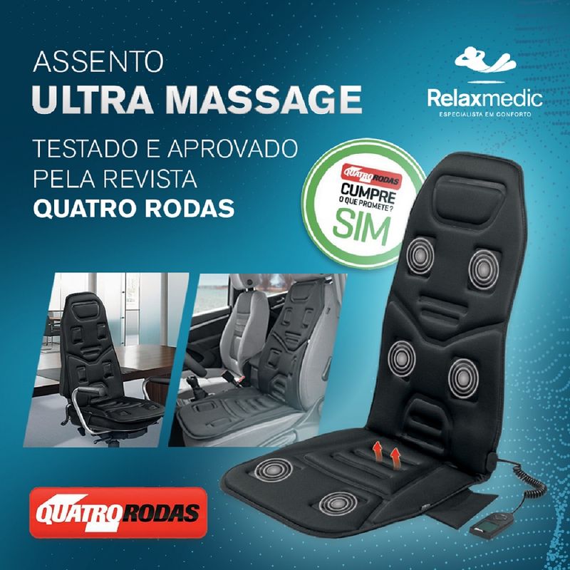O Assento Ultra Massage da Relaxmedic garante seu relaxamento onde você estiver. Dobrável e fácil de guardar, esse massageador se adapta à poltrona, cadeira e até no carro (basta conectar o adaptador para carros – incluso).