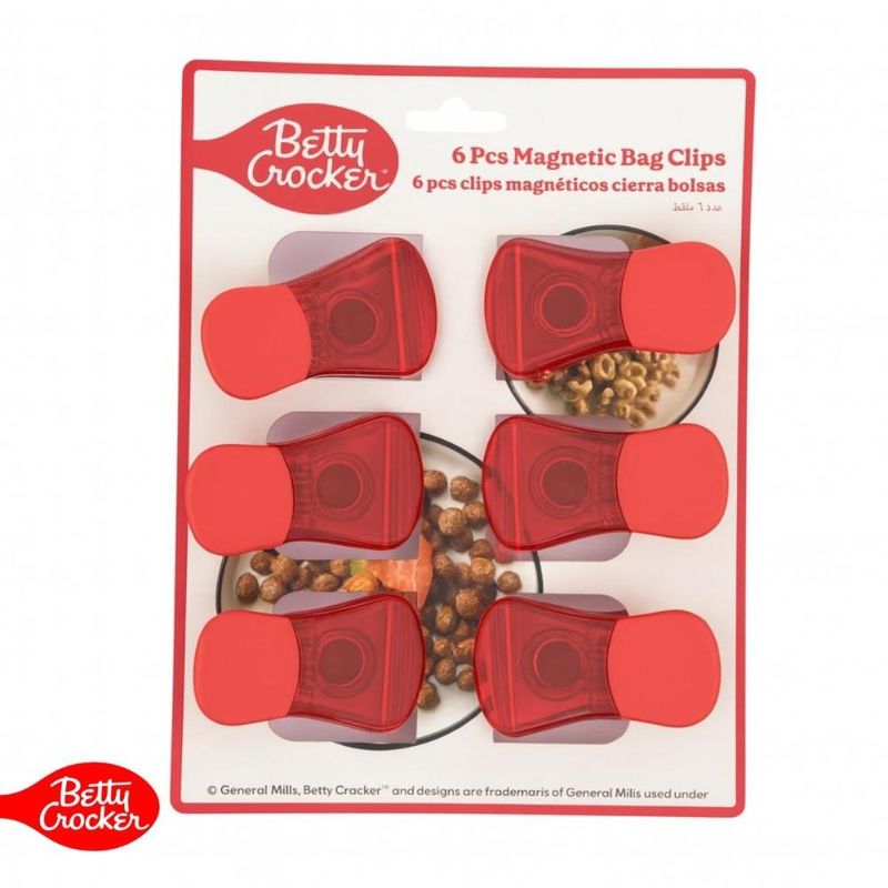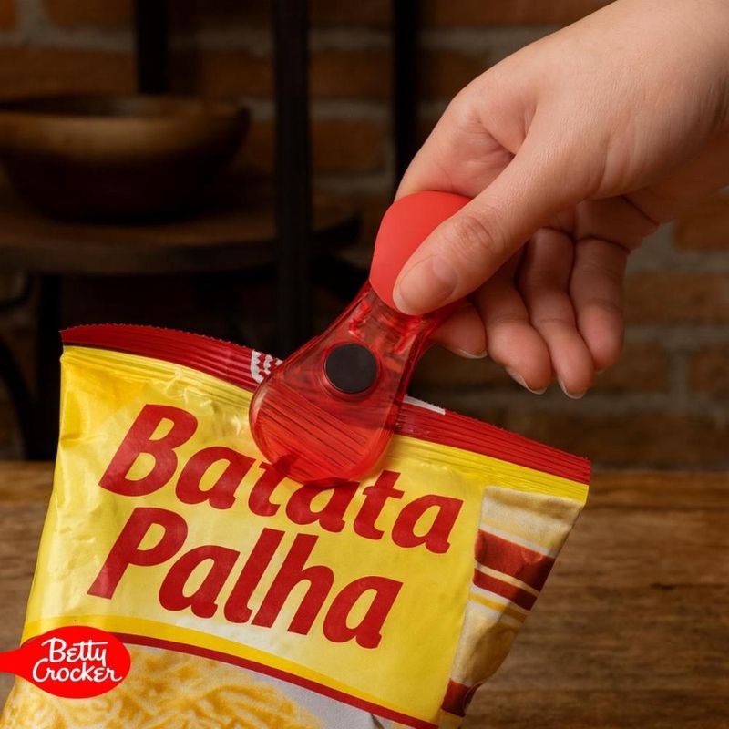 O Kit 2 em 1 da Betty Crocker inclui 6 clipes ideais para fechar com segurança sacos de snacks, alimentos congelados e outros mantimentos, preservando sua frescura por mais tempo.