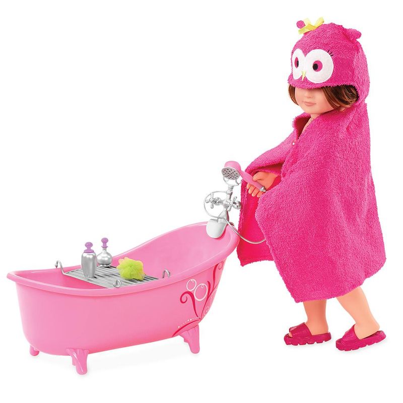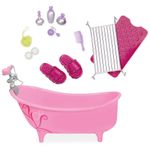 Acabou de voltar de uma viagem ou simplesmente de um longo dia na escola? O Conjunto de Banheira Our Generation vem com tudo que você precisa para o banho perfeito. Encha a banheira, jogue as fatias de pepino e relaxe no final de uma de suas muitas aventuras emocionantes! O conjunto inclui banheira rosa com torneira, bandeja de banheira, esponja de banho, tapetinho de banheiro, duas fatias de pepino, três frascos de sais de banho, pente, perfume, roupão rosa de coruja e um par de chinelos. Acessórios faz de conta. Bonecas vendidas separadamente.