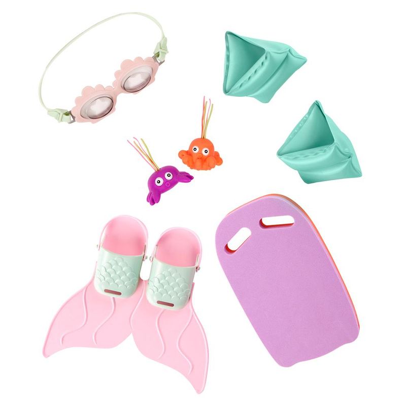 Prepare-se para mergulhar em um mar de aventuras com o encantador Kit de Natação Contos de Sereia Our Generation! Este conjunto temático transforma qualquer momento em uma história mágica de verão, com acessórios incríveis para bonecas de 46 cm. A nadadeira de sereia estilizada adiciona um toque de fantasia ao visual da boneca, enquanto a prancha de natação bicolor e os óculos com detalhes de concha e estrela-do-mar garantem muita diversão nos jogos de faz de conta. O kit também inclui brinquedos de mergulho em formato de polvo e caranguejo, além de boias infláveis de braço que completam o look e estimulam a imaginação. Ideal para compor cenários de praia, piscina ou fundo do mar, esse conjunto é compatível com a maioria das bonecas Our Generation e outros acessórios da linha. Crie histórias incríveis e explore o mundo aquático com estilo e criatividade com o Kit de Natação Contos de Sereia! Bonecas e roupas de banho vendidas separadamente.