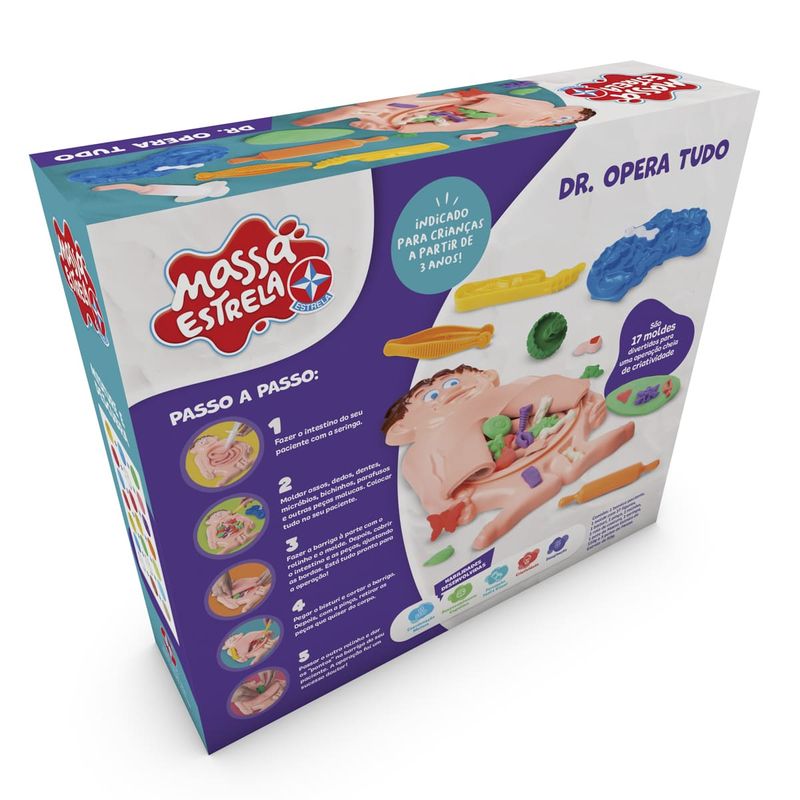 Com Dr. Opera Tudo de Massa Estrela, você pode abrir e cortar a barriga do paciente para inserir ossos, borboletas e tudo o que a imaginação puder criar! Depois é só costurar tudo e começar novamente. Vem com 3 potes de Super Massa de 50g e 1 pote de 140g.