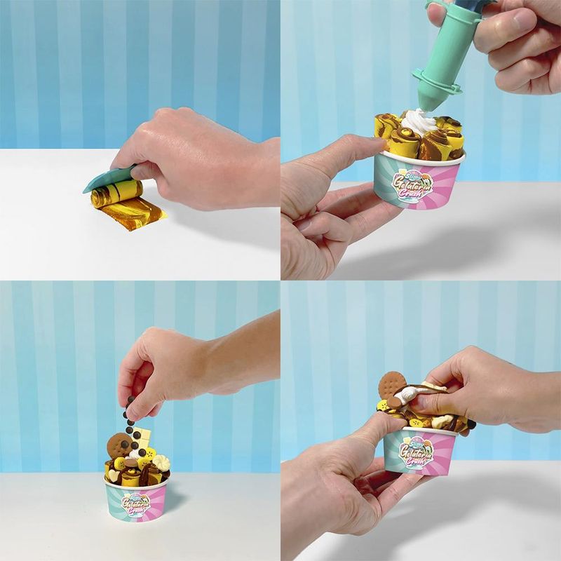 Com o Kit Slimy de Sorvete Slimy Gelateria, as crianças podem criar sorvetes de slime superrealistas em cones ou rolos! Misture e modele os ingredientes para formar sorvetes deliciosos, decorando com confeitos e brilhos. Depois, esmague para uma sensação cremosa e divertida. Ideal para estimular a criatividade e habilidades motoras, proporcionando uma experiência sensorial única e divertida.