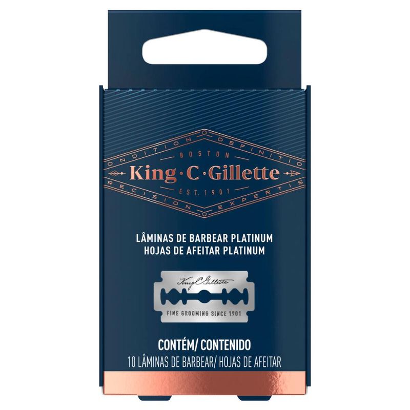 CONTÉM: 10 lâminas de barbear duplo fio com platina King C. Gillette