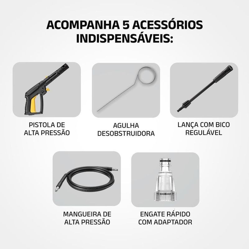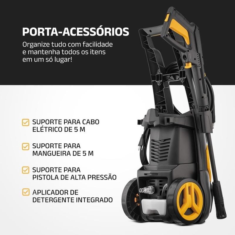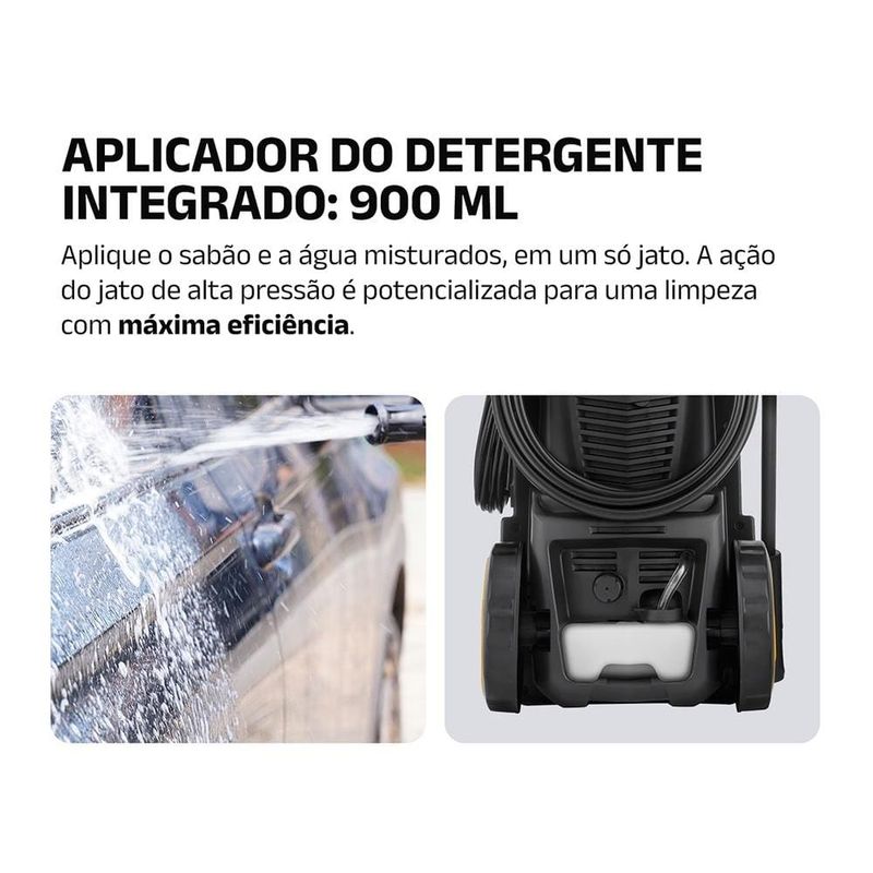 Seu motor de 1.800W garante durabilidade e ótimo desempenho, enquanto o engate rápido facilita a conexão da mangueira, prevenindo vazamentos e otimizando o uso. A lavadora também permite o uso com detergente, facilitando a lavagem de veículos, pisos e áreas com sujeiras engorduradas.