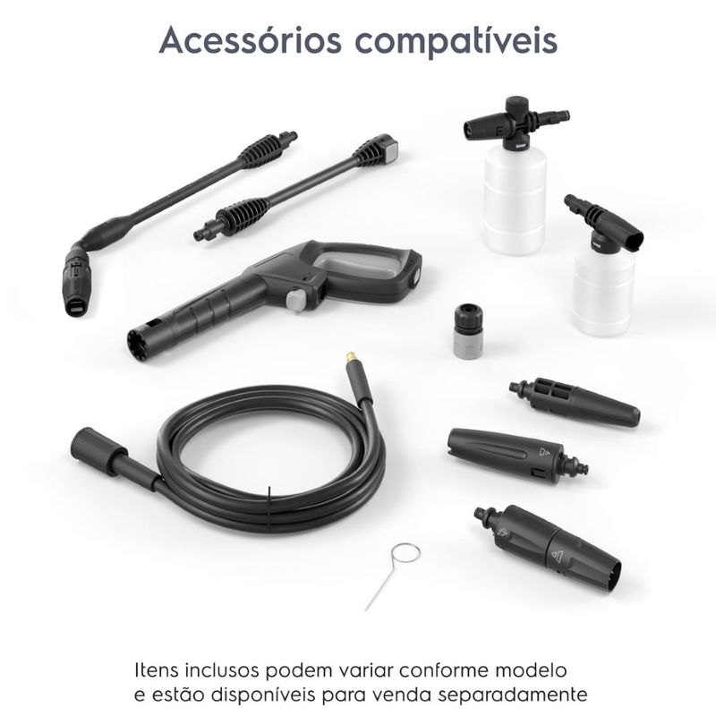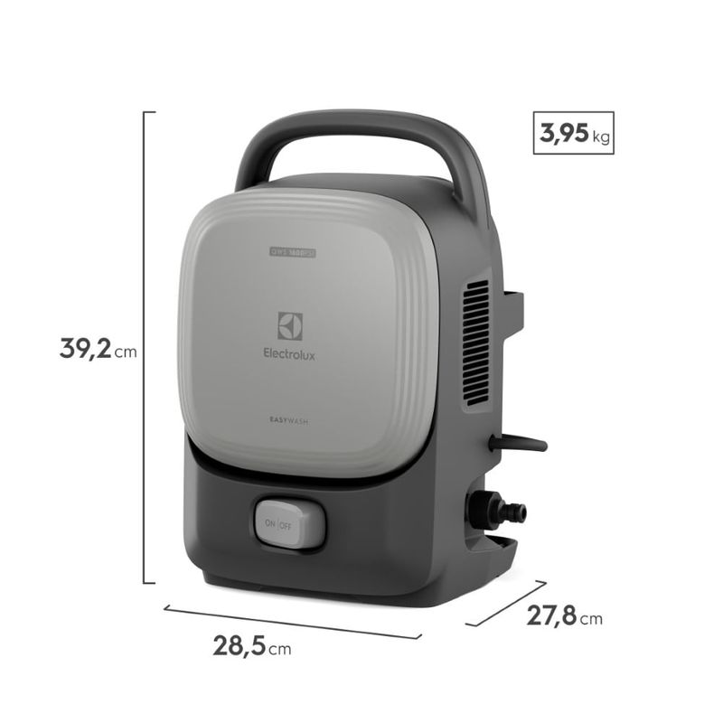 Com um design compacto, a lavadora de alta pressão Electrolux é fácil de transportar graças à alça de desenho ergonômico, e conta com porta acessórios com suporte para cabo elétrico e mangueira. Além disso, pode ser utilizada para limpar áreas maiores, já que oferece uma mangueira de 3 metros e cabo elétrico de 5 metros.