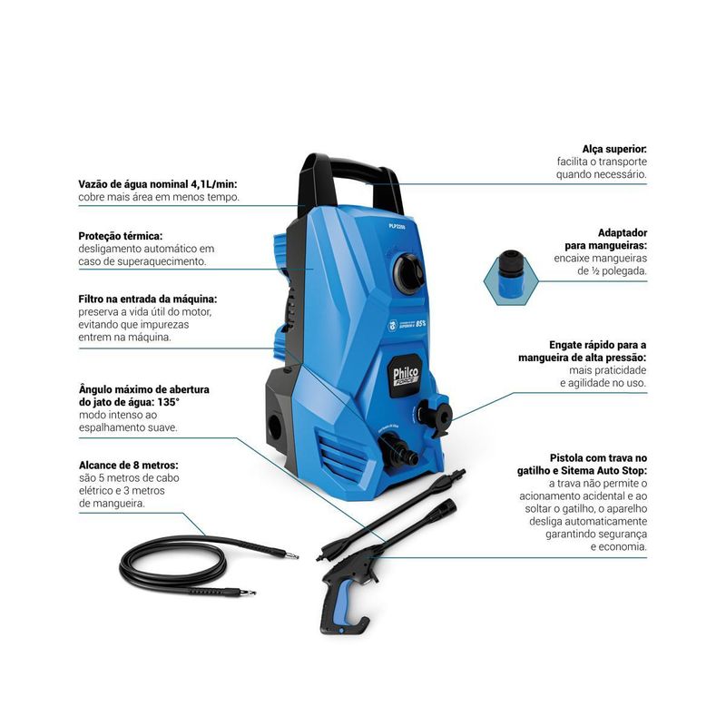A Lavadora de Alta Pressão Philco conta ainda com acessórios práticos, como pistola, lança, filtro lavável, engate rápido e suporte para armazenamento traseiro, além do prolongador de ponteira que facilita o acesso a locais mais altos. Com a Lavadora de Alta Pressão Philco 1300W PLP2200, você transforma o cuidado com o lar em uma experiência mais ágil, segura e eficiente.