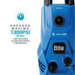 Com vazão de água de até 5,2L/min e economia superior a 85% no consumo de água, a Lavadora de Alta Pressão Philco alia potência à responsabilidade ambiental. O longo alcance de 8 metros, somando cabo elétrico de 5m e mangueira de 3m, amplia sua mobilidade para alcançar todos os cantos da casa ou do negócio.