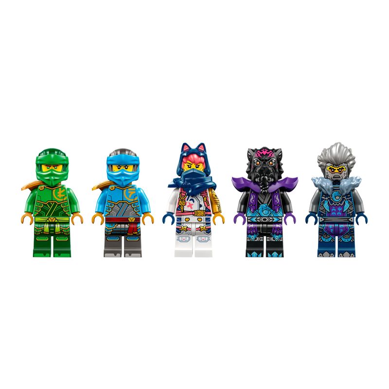 5 minifiguras LEGO® NINJAGO® – As crianças podem encenar batalhas entre os guerreiros ninja Lloyd, Sora e Nya, todos armados com elementos de mini espada katana, contra Lord Ras com seu martelo e Cinder com uma espada