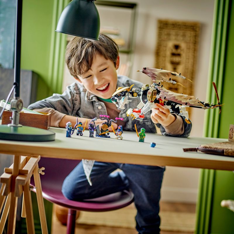 Crianças a partir de 8 anos podem recriar aventuras emocionantes da 2ª temporada do programa de TV NINJAGO® Dragons Rising com este grande conjunto de brinquedo de herói Egalt, o Mestre Dragão (71809). Este é o primeiro brinquedo Master Dragon da linha NINJAGO e apresenta pernas, cauda, ??cabeça e asas de alumínio ajustáveis, seu próprio acessório de espada e um suporte para acessórios de katana nas costas.