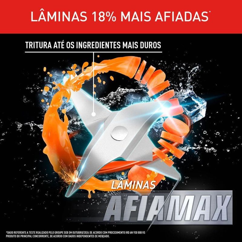 As lâminas AFIAMAX em aço inox são 18% mais afiadas, ultra duráveis e desenvolvidas para cortar até os ingredientes mais duros com precisão e eficiência. Assim, você garante resultados consistentes em todas as receitas.