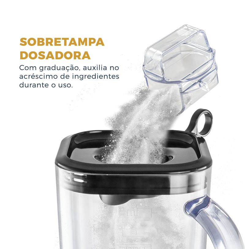 Jarra transparente com capacidade de até 3 litros e filtro que separa semente e bagaço, e sobre tampa dosadora, com graduação, para não esquecer nenhum ingrediente na medida certa da receita.